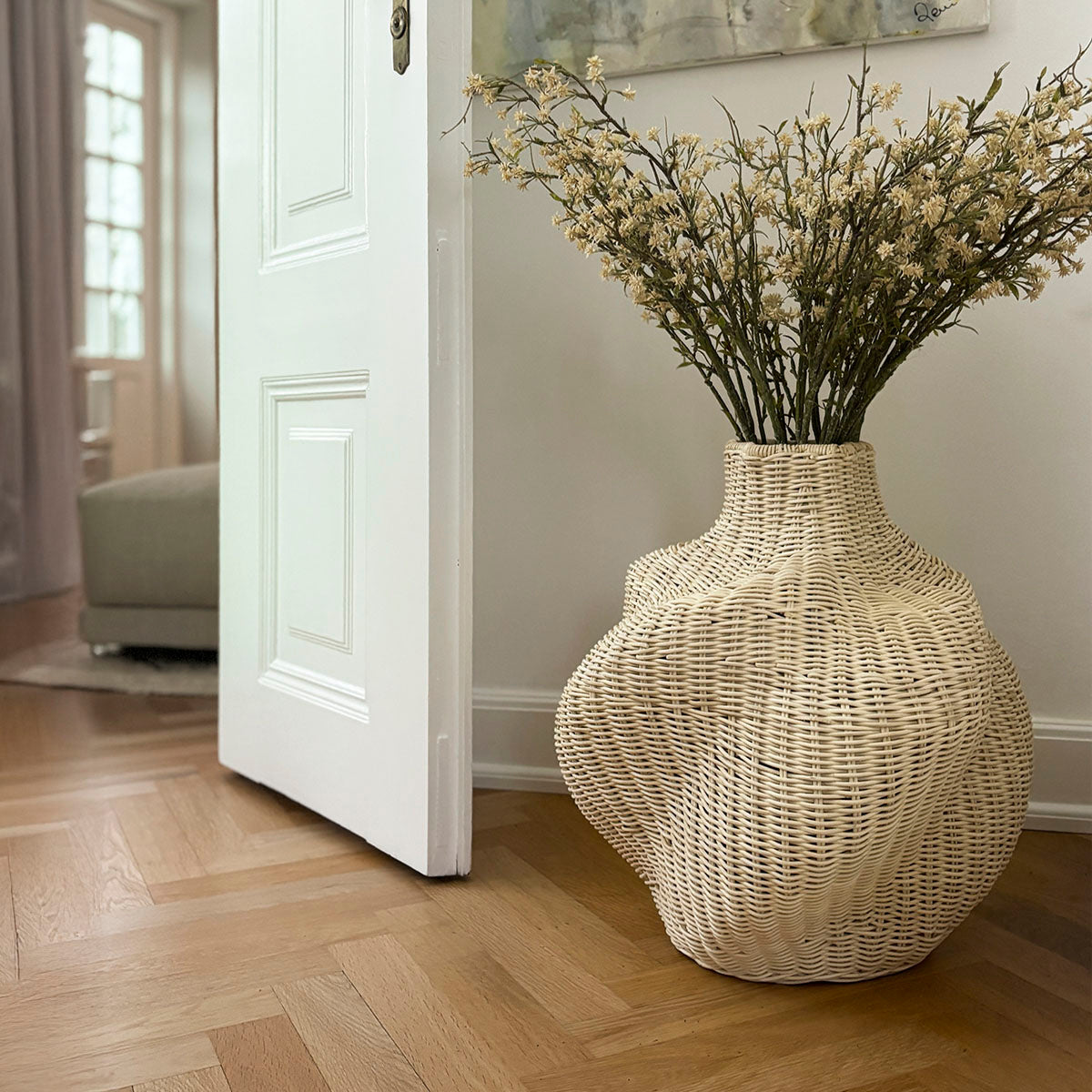 Solaris er en dekorativ kurv med bløde, organiske former, der egner sig godt til tørrede eller kunstige blomster. Kurven er håndflettet i naturmaterialet rattan og der kan derfor være små variationer i farve og form.