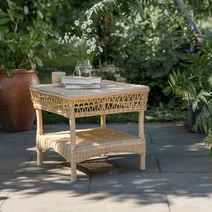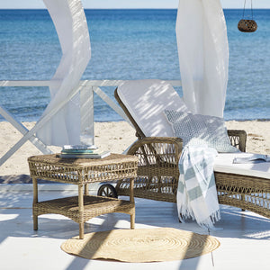 Susy Exterior er et udendørs sofabord og en del af Sika-Designs romantiske Georgia Garden kollektion. Georgia Garden kollektionen repræsenterer et stort udvalg af charmerende udendørs kurvemøbler, der er inspireret af den britiske kolonistil og af gamle danske pilefletsmøbler.