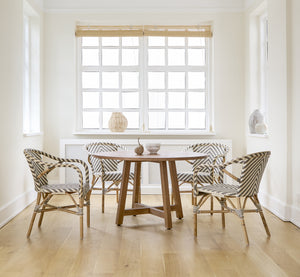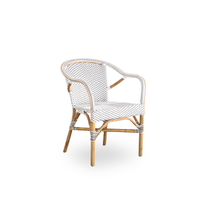 Madeleine spisebordstol med er lavet af indonesisk bæredygtig rattan. Stolen er udført i ubehandlet naturrattan og fremstår med en rå upoleret overflade. Sæde og ryg er håndflettet på et stel af rattan af dygtige kurvemagere. Madeleine rattanstol har armlæn, ryglæn og er stabelbar.